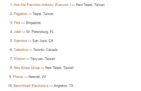 Les entreprises ont été classées en fonction de leurs ventes en dollars américains, ce qui n’a pas favorisé les sociétés européennes et asiatiques. Par ordre décroissant, les dix premières entreprises de 2016 étaient Hon Hai/Foxconn, Pegatron, Flex, Jabil, Sanmina, Celestica, Wistron, New Kinpo Group, Plexus et Benchmark Electronics. Trois entreprises sont sorties de la leste du top 10 : Topscom, Kitron et TT Electronics. Elles ont été remplacées par Sparton, Alpha Networks et Prime Base.