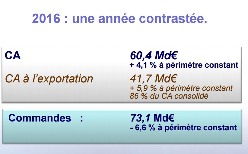 En termes de commandes, 2016 est une très bonne année avec 73,1 milliards d’euros (-6,6% par rapport à 2015 qui avait constitué une année record). Le carnet de commandes global de la profession représente environ 5 années de production. Ces performances permettent à la profession de dégager, une fois de plus, le premier solde excédentaire de la balance commerciale française en 2016 avec (18,6 milliards d’euros).
