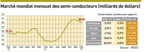 > Les ventes européennes de semi-conducteurs ont atteint 2,819 milliards de dollars en février 2017, en progression de 5,9% par rapport au même mois de 2016, selon le WSTS. Ces résultats sont en ligne (dans une moindre mesure) avec les tendances observées au niveau mondial (hausses de 19,1% sur le continent américain et de 25%