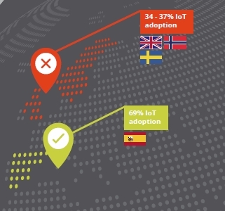 L’Espagne détient le plus fort taux d’adoption de l’IoT en Europe, 69 % des personnes interrogées affirmant avoir déjà déployé cette technologie. La France et l’Italie ne sont pas en reste, avec un taux d’adoption relativement important (61 %). L’Allemagne se situe à 54 %. Le Royaume-Uni et la Suède (tous les deux à 37 %), de même que la Norvège (34 %), affichent le résultat le plus bas de tous les pays couverts par cette étude mondiale, avec un taux d’adoption près de deux fois inférieur à celui du pays européen en tête du classement.
