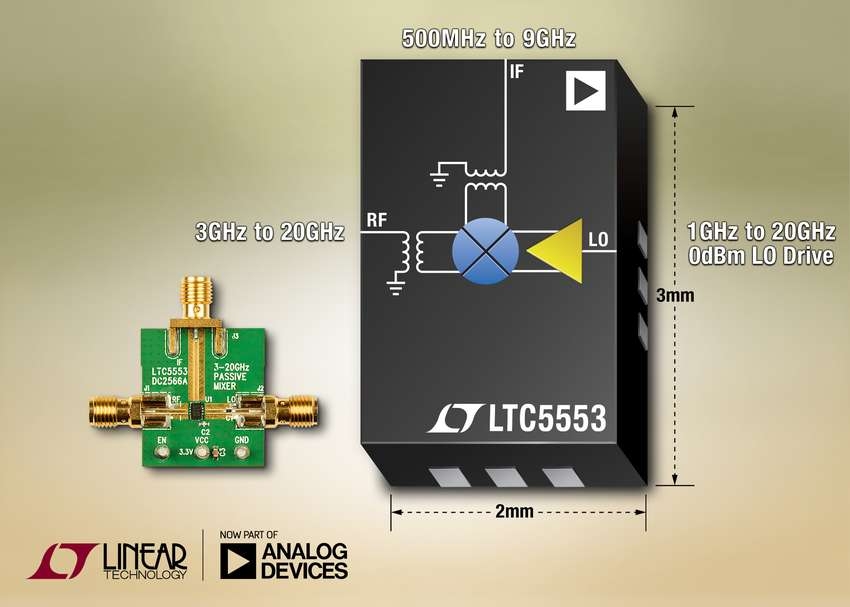 Le LTC5553 de Linear Technology (Analog Devices) est caractérisé par une bande passante RF de 3 à 20 GHz et par d’excellentes performances en termes de linéarité.