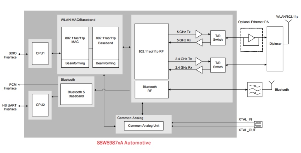 Les 88W8987xA se distinguent également par la présence de multiples mécanismes de coexistence afin de limiter les perturbations entre réseaux Bluetooth, Wi-Fi et LTE. Ils ont été pensés pour supporter les futurs réglementations de communication entre véhicules (V2V) et avec les infrastructures routières (V2I), notamment les normes américaines NHTSA, FMVSS et DSRC. Des pilotes sont disponibles pour Android, Linux et QNX. Ces circuits seront disponibles en volume au dernier trimestre 2017.