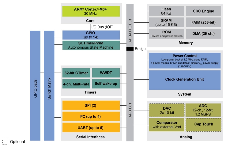 Les LPC84x embarquent jusqu’à 64Ko de mémoire flash et 16Ko de Sram, des convertisseurs analogique-numérique 12 bits et numérique-analogique 10 bits et des temporisateurs 32 bits, ainsi qu’une matrice de commutation permettant d’affecter n’importe quelle fonction périphérique à n’importe quelle broche d’entrée-sortie à usage général. Le LPC845 bénéficie en outre d’un bloc de détection tactile capacitif susceptible de fonctionner alors que le coeur est en mode veille.