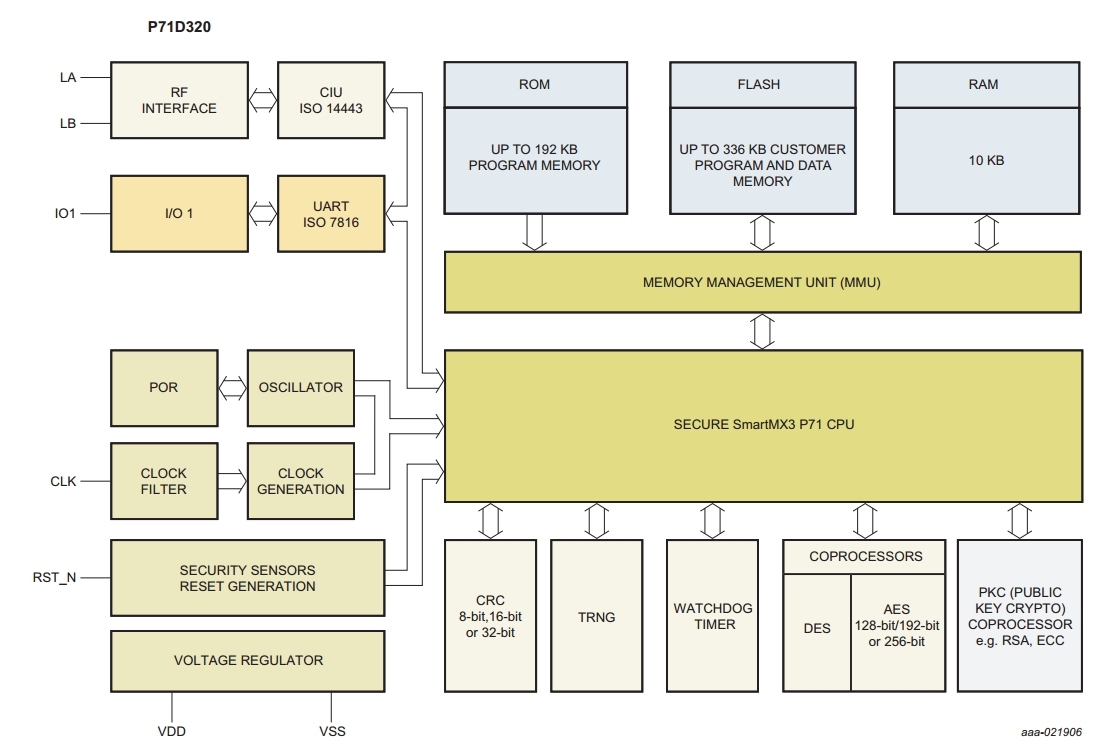 Certifié Common Criteria EAL6+, ce circuit s’appuie sur un coeur 16/32 bits MRK3-SC et une architecture mémoire dite FlexMem mêlant flash (jusqu’à 336Ko) et Rom (134Ko max) dont l’endurance a été renforcée. Les délais de transaction ont été accélérés de 30% à 230ms, ceux d’identification eGov SAC ePP passant sous la barre des 2s. Le moteur de cryptage gèrent les standards RSA/ECC, DES/3DES et AES. La partie firewall a également été revue, avec notamment la possibilité de faire tourner deux instances logicielles indépendamment l’une de l’autre. Fabriqué en technologie Cmos 90nm, le P71D320 dispose d’interfaces à contact (ISO/IEC 7816) et sans contact (ISO/IEC 14443) avec des débits de données culminant à 3,4Mbit/s.