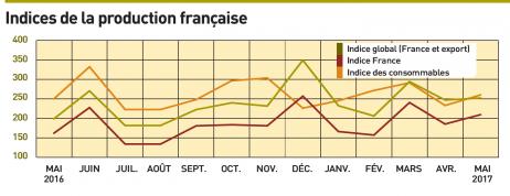 Pour l’indice global de Production fourni par Acsiel Alliance Electronique Collège Equipements et Services (ex-GFIE), la base 100 est en 1995. Celle de l’indice des consommables débute en janvier 2001 (les consommables entrent eux-mêmes dans le calcul de l’indice global).
