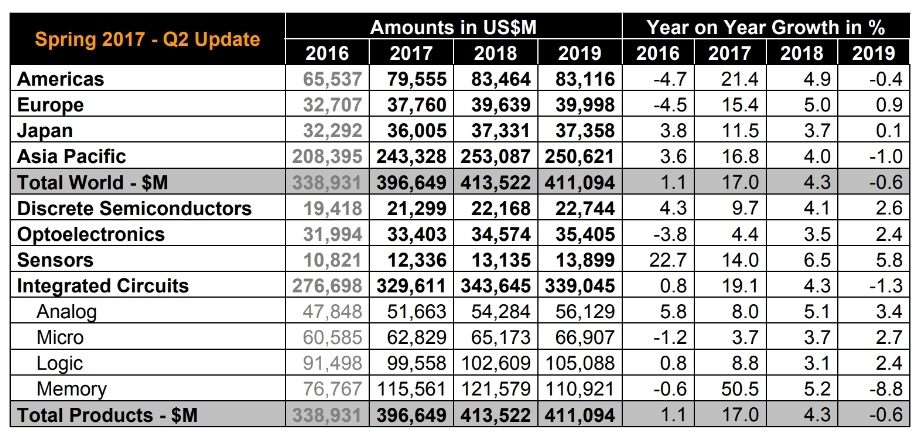 En 2017, la plus forte croissance est attendue dans les capteurs, les composants analogiques et les mémoires. Cependant, toutes les familles de produits contribueront à la croissance et toutes les régions devraient également reprendre leur croissance cette année.