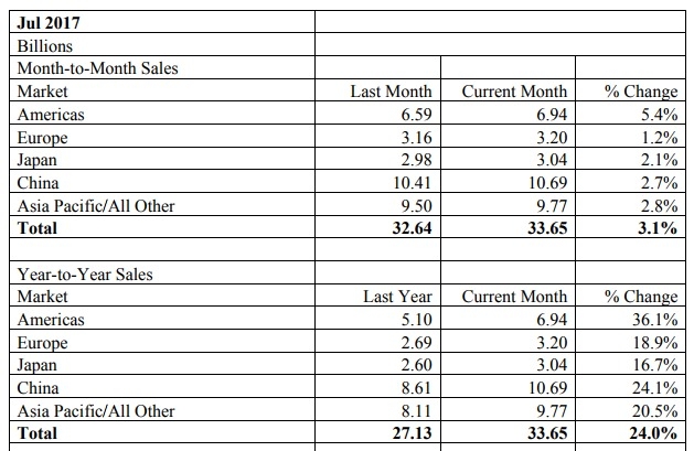 Les ventes mondiales de semi-conducteurs ont atteint 33,6 milliards de dollars en juillet 2017, en progression de 24% par rapport à la même période de l’an passé et 3,1% par rapport à juin 2017. Tous les principaux marchés régionaux ont affiché des augmentations d’une année à l’autre et d’un mois à l’autre en juillet. Les Amériques ont réalisé une croissance de 36,1% d’une année à l’autre et de 5,4% mensuellement. Ces données viennent d’être publiées par le WSTS (World Semiconductor Trade Statistics) et ont été relayées par la SIA (l’association américaine de l’industrie des semi-conducteurs).