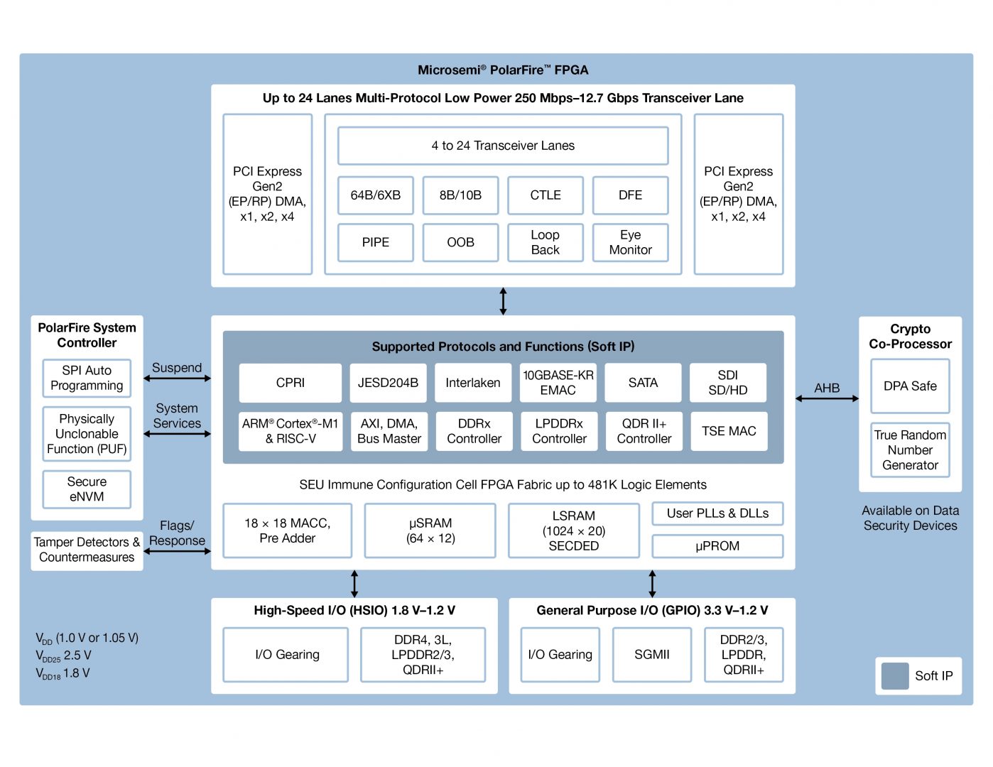 Microsemi a développé une interface haut débit JESD204B optimisée pour ses récents circuits logiques programmables PolarFire et leur permettant par exemple de se connecter facilement à des circuits d’émission-réception RF large bande tels que l’AD9371 d’Analog Devices, ou encore à des convertisseurs analogique-numérique et numérique-analogique rapides. Cette interface JESD204B est disponible en différentes largeurs (x1 à x8) avec des débits de données allant de 250Mbit/s à 12,5Gbit/s par ligne. Des conceptions de référence mettant en oeuvre cette interface au sein d’un FPGA PolarFire sont disponibles dans le cadre de l’environnement de conception Libero de l’américain.