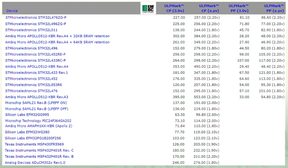 Ce banc d’essai ULPMark-PP vient compléter l’ULPMark-CoreProfile qui, lui, ne jauge que les performances du coeur du microcontrôleur. Plusieurs microcontrôleurs ont déjà été testés, à savoir des modèles de STMicroelectronics et d’Ambiq Micro ; les résultats permettent de constater que si les Apollo de l’américain disposent d’un net avantage au niveau du coeur 32 bits, les STM32 du franco-italien rattrapent une partie de leur handicap énergétique grâce à une meilleure gestion de leurs blocs périphériques.
