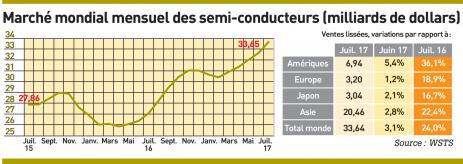 > Très bonne dynamique pour les ventes mondiales de semi-conducteurs, en progression de 24% en juillet par rapport à la même période de l’an passé. Elles avaient déjà progressé de 23,7% en juin 2017 par rapport à juin 2016. Sur les six premiers mois de l’année, la croissance est de 14,6% supérieure à ce qu’elle