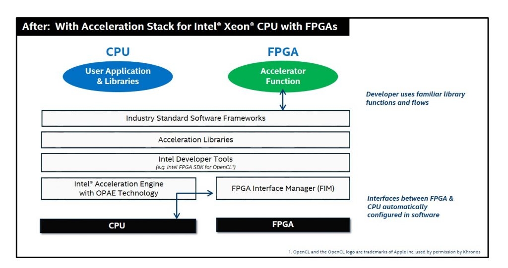 La technologie Open Programmable Acceleration Engine offre une interface commune entre un processeur Xeon et un FPGA utilisé comme accélérateur de traitement de données via une API commune. Enfin, Intel lance un kit de développement logiciel baptisé FPGA SDK et supportant le langage OpenCL en plus du RTL, ce qui accélère le développement.