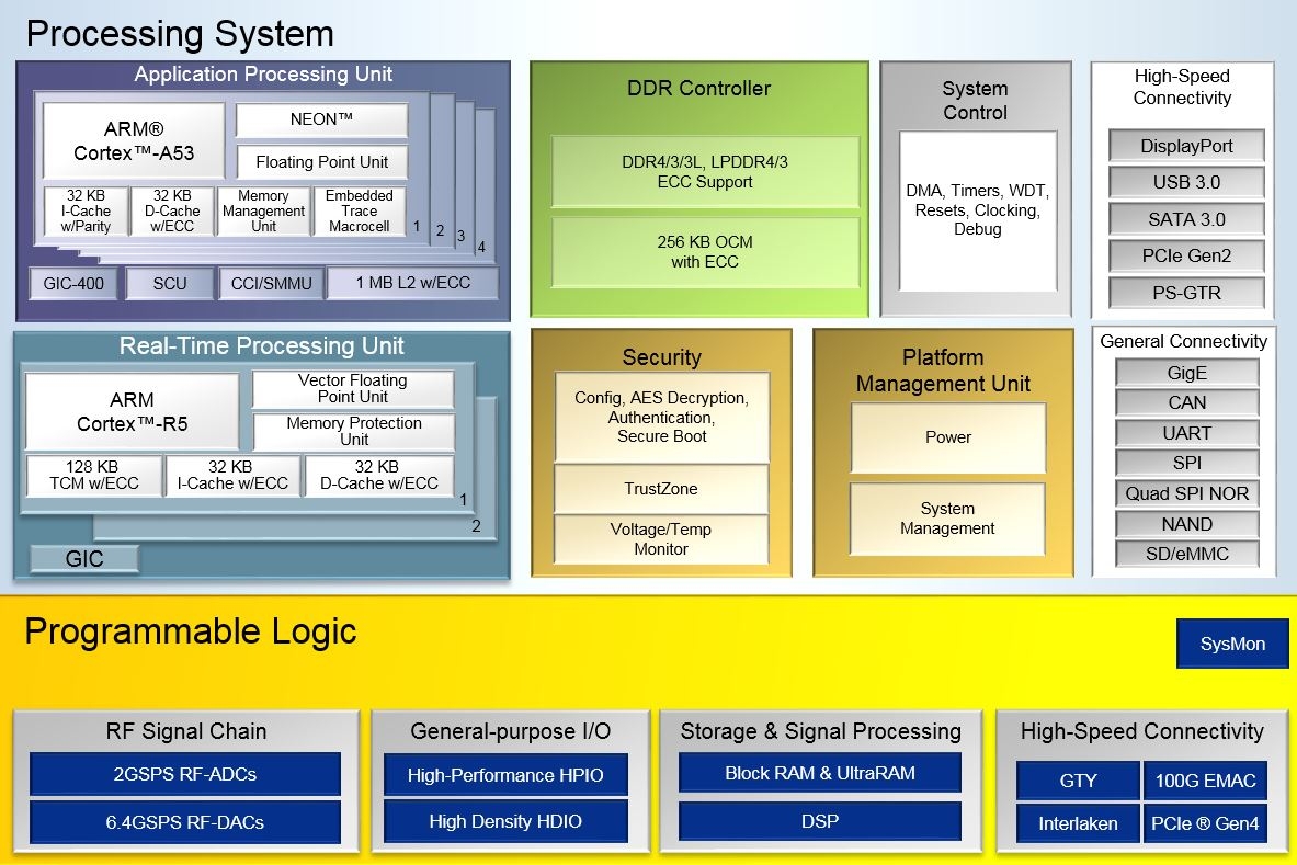 Les Zync RFSoC embarquent huit à seize convertisseurs analogique-numérique 12 bits 2Géch./s, huit à seize convertisseurs numérique-analogique 14 bits 6,4Géch./s ainsi qu’un sous-ensemble ARM à quatre coeurs Cortex-A53 et deux coeurs Cortex-R5. La partie FPGA comprend jusqu’à 930000 cellules logiques et 4200 blocs DSP.