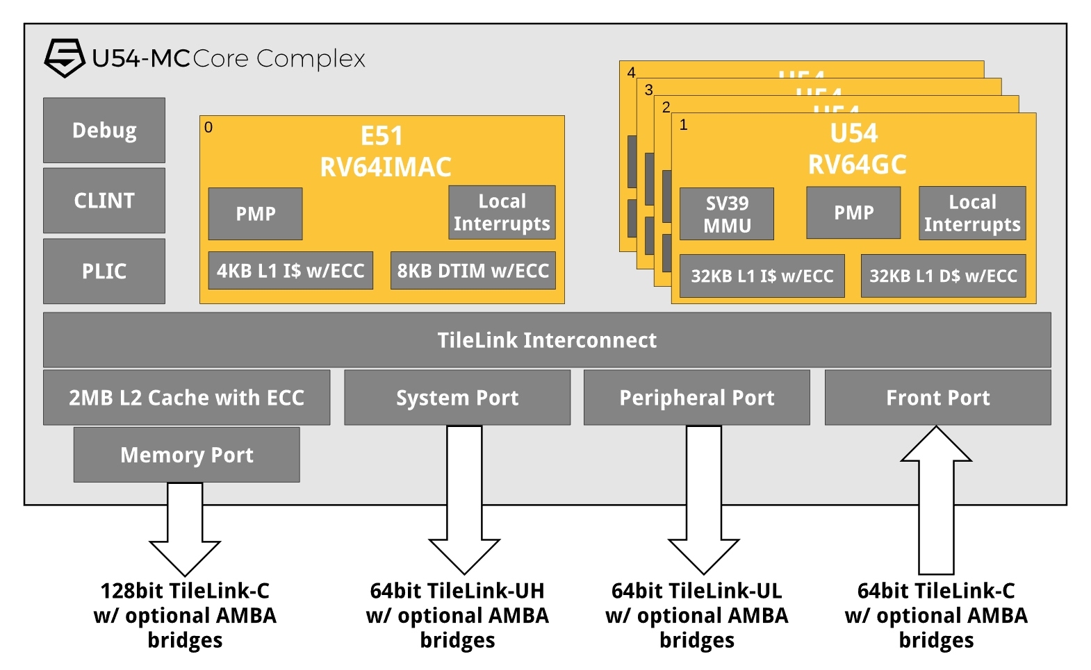 SiFive vient d’annoncer la disponibilité d’un processeur multicoeur 64 bits à architecture RISC-V baptisé U54-MC et capable de tourner sous Linux. Disponible sous forme d’IP, ce processeur comprend quatre coeurs U54 orchestrés par un coeur E51. Il s’agit selon SiFive du premier processeur commercial utilisant l’architecture ouverte RISC-V à intégrer plusieurs coeurs et une mémoire cache cohérente (ici 2Mo de cache de niveau 2).