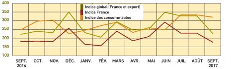 Pour l’indice global de Production fourni par Acsiel Alliance Electronique Collège Equipements et Services (ex-GFIE), la base 100 est en 1995. Celle de l’indice des consommables débute en janvier 2001 (les consommables entrent eux-mêmes dans le calcul de l’indice global).