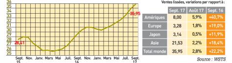> Les ventes mondiales de semi-conducteurs ont atteint 107,9 milliards de dollars au 3 e trimestre 2017, en hausse de 10,2% par rapport au trimestre précédent, selon le WSTS (World Semiconductor Trade Statistics). Les ventes cumulées sur 9 mois jusqu’à septembre dépassent de plus de 20% celles