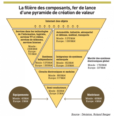 Le cabinet Décision a présenté les réalités économiques du marché de l’électronique et plus particulièrement de la sous-traitance en France et en Europe, soutenant notamment que la France est le premier pays européen de la fabrication de cartes électroniques assemblées. Le cabinet d’études Décision estime par ailleurs que la France est le 2è pays européen de la fabrication de produits informatiques, électroniques et optiques et que 85% du chiffre d’affaires des fabricants d’équipements électroniques de nationalité française se fait à destination de l’électronique professionnelle. Conclusion du Cabinet Décision : la France dispose du socle industriel en électronique professionnelle pour répondre aux nouveaux besoins des secteurs industriels dans le nouveau « Smart World » en construction. L’industrie électronique devrait ainsi pouvoir tenir le rôle de socle industriel pour transformer notre industrie vers le « Smart World » de demain. C’est la raison pour laquelle la feuille de route « Industrie électronique du futur » doit être le point de départ d’une ambition collective nationale, estiment les industriels.