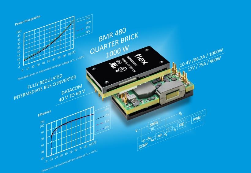 Le BMR480 de Flex Power Modules fournit plusieurs sorties préprogrammées à partir d’une entrée comprise entre 40V et 60V. Son rendement amximal est donné pour 97%.