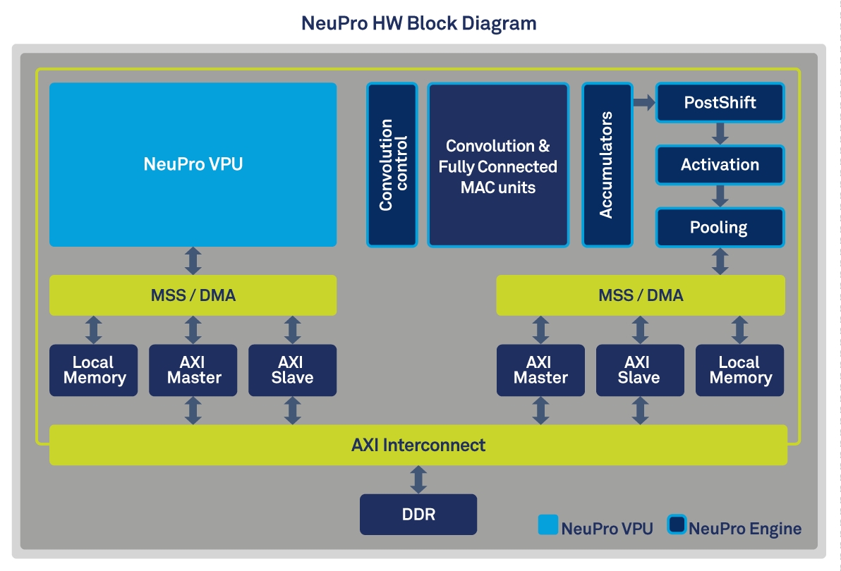 Chacun de ces processeurs associe un moteur NeuPro, implémentation matérielle des couches de réseau neuronal, et un VPU NeuPro, DSP vectoriel programmable gérant la partie logicielle du réseau CDNN. L’architecture NeuPro supporte les réseaux 8 et 16 bits. Outre les processeurs NP500/1000/2000/4000, elle est disponible sous la forme d’accélérateurs pouvant être associés à des processeurs traditionnels tels que les CEVA-XM4/6. La famille NeuPro sera disponible sous licence à partir de l’été 2018.