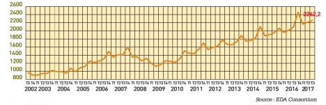 > Selon les derniers chiffres publiés par l’EDA Consortium, le marché mondial de la CAO électronique a atteint 2262,2M$ au 3 e trimestre 2017, soit une progression de près de 2,5% comparé aux 2209,2M$ du trimestre précédent. Sur un an, ce marché poursuit sa bonne