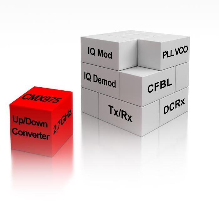 Dans un boîtier de 6x6mm, le convertisseur de fréquence CMX975 associe notamment des mélangeurs, des synthétiseurs à PLL et leurs VCO et un amplificateur faible bruit