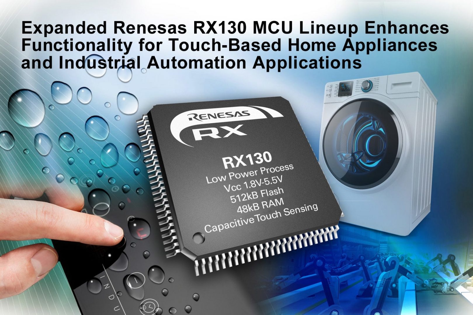 Renesas Electronics ajoute 38 nouvelles références à sa gamme de microcontrôleurs RX130, des modèles étendant la mémoire flash embarquée à 256, 384 et 512Ko et la taille des boîtiers à 100 broches. Les microcontrôleurs 32 bits RX130 sont destinés, entre autres, aux systèmes domotiques et industriels impliquant une commande tactile – ces nouveaux modèles bénéficient d’ailleurs d’une nouvelle IP de détection tactile capacitive. Alimentés sous 1,8V à 5,5V et cadencés jusqu’à 32MHz, ils embarquent jusqu’à 24 canaux de conversion analogique-numérique 12 bits, un accélérateur CRC ou encore un oscillateur complet.