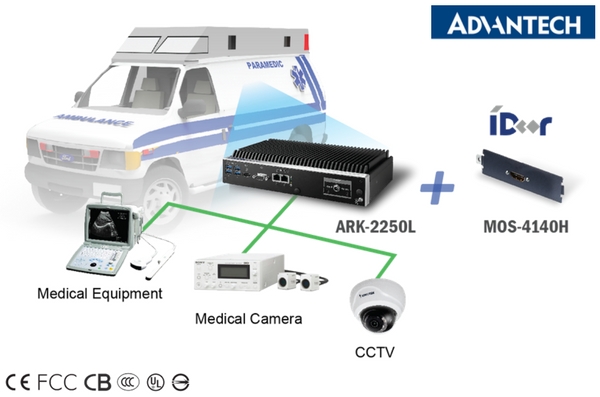 Pour cette application de télé-médecine en ambulance, Advantech a proposé un boîtier modulaire sans ventilateur ARK-2250L, associé à un iDoor vidéo MOS-4140H qui fournit une interface HDMI permettant au système de récupérer les données d’une caméra vidéo et d’effectuer la vidéo-conférence via plusieurs écrans à bord du véhicule.
