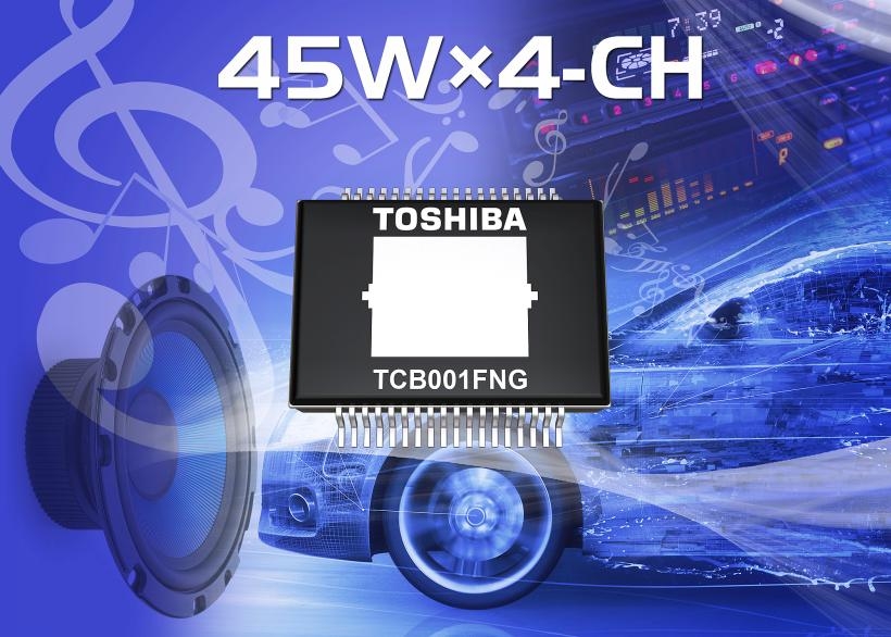 Le TCB001FNG en boîtier CMS offre quatre canaux délivrant chacun 45W, sous une charge de 4 Ohms et avec une tension d’alimentation de 15,2V.