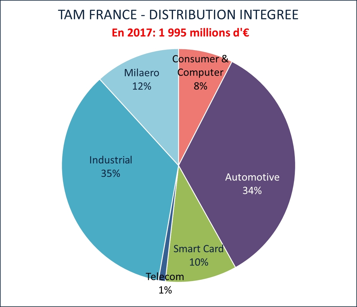 Depuis 2015, le marché français a retrouvé son niveau de 2007, autour de 2 milliards d’euros, enregistrant en 2017 une croissance de 1%. Les ventes aux distributeurs, en nette progression de 10,6% par rapport à 2016, ont constitué la plus forte contribution à la croissance annuelle. En 2017, le canal de la distribution a représenté pour la première fois 32% des ventes de semi-conducteurs en France, soit une progression de 10 points de part de marché en 10 ans (celle-ci était de 22% en 2007).