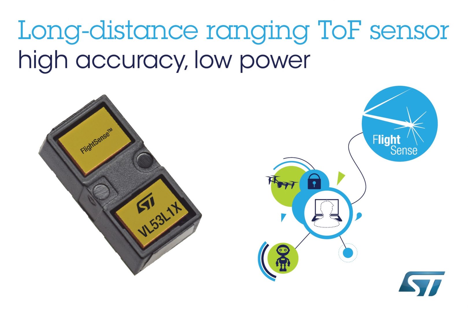 STMicroelectronics étend la portée de ses capteurs ToF (time of flight) à quatre mètres avec le VL53L1X, qui vise par exemple la détection d’obstacle pour des systèmes robotiques ou des drones, la mise en veille d’ordinateurs ou d’objets connectés, ou l’autofocus. Il dispose d’une fonction de détection de présence capable de piloter sa mise en veille et son activation en cas d’évènement.