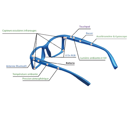 D’un poids de 16 grammes, elles ont une autonomie d’une journée. Commercialisées depuis le 23 avril 2018 dans le réseau Optic 2000, les montures sont vendues au prix de 249€ TTC et de 289€ TTC avec un chargeur. Dans le cadre d’une utilisation médicale, elles bénéficient d’une prise en charge de l’assurance maladie et des mutuelles. Le DAS (débit d’absorption spécifique indiquant la quantité d’énergie véhiculée par les ondes radiofréquences reçues par l’usager d’un appareil radioélectrique) est équivalent a moins de 5 secondes de communication sur un téléphone mobile pour une journée complète de port des lunettes