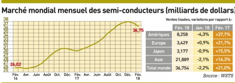 > Les ventes mondiales de semi-conducteurs ont totalisé 36,754 milliards de dollars en février, en baisse de 2,2 % par rapport à janvier, mais en hausse de 21 % par rapport à février 2017. Selon la SIA, l’association américaine des fabricants de semi-conducteurs, il s’agit du 19 e mois de suite de hausse des ventes