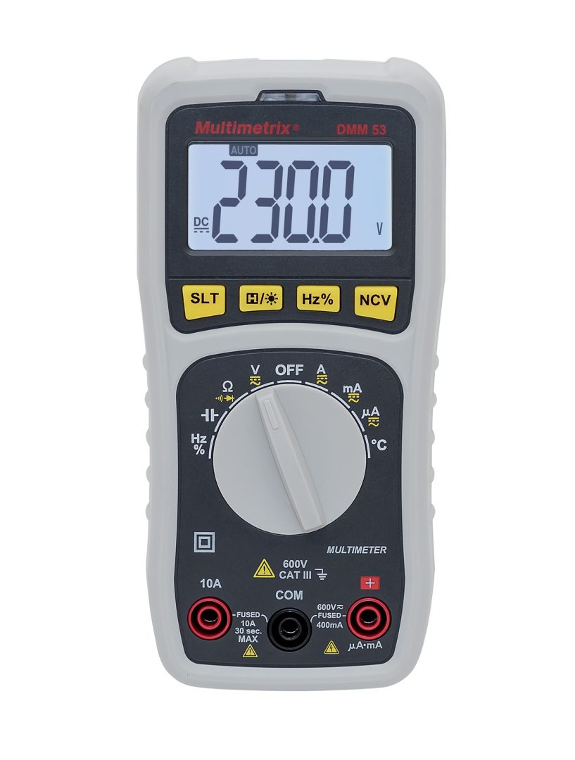 Quant au multimètre numérique DMM53 (voir photographie), les utilisateurs bénéficient d’une gamme de tension de 400 mV à 600 V DC ou 4 à 600 V AC, des gammes de courant de 400 µA à 10 A AC et DC, des mesures de résistances (400 Ω à 40 MΩ), de capacité, de température, de rapport cyclique, du test de diode et de continuité, de la détection de présence de tension sans contact (NCV), etc.