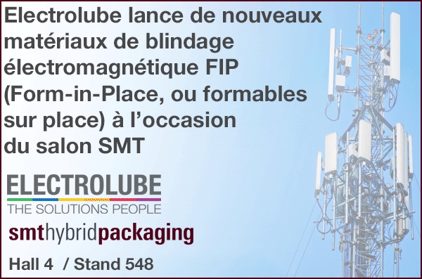 Le fabricant mondial de produits électrochimiques Electrolube s’apprête à lancer une nouvelle gamme de matériaux de blindage électromagnétique FIP et une toute nouvelle colle conductrice à l’argent à l’occasion du salon SMT Hybrid Packaging qui se tiendra à Nuremberg, du 5 au 7 juin prochain.