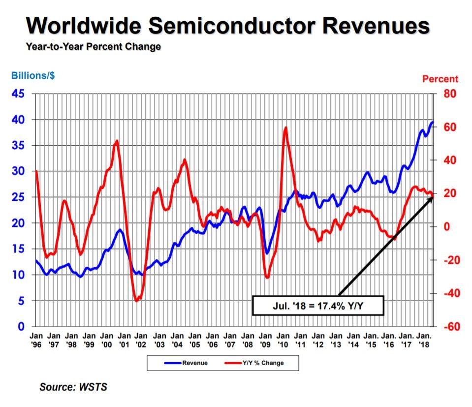 Les ventes mondiales de semi-conducteurs ont atteint 39,5 milliards de dollars en juillet 2018, contre 33,6 milliards en juillet 2017, soit une progression de 17,4% par rapport à la même période de l’année dernière, a annoncé la SIA (l’assaociation américaine de l’industrie des semi-conducteurs) qui relaie les données du WSTS (World Semiconductor Trade Statistics), l’organisation en charge des statistiques sur l’industrie des semi-conducteurs. Il s’agit d’un record sans précédent pour un mois de juillet et même d’un record mensuel absolu. Par ailleurs, les ventes mondiales en juillet 2018 ont été de 0,4% supérieures au total de 39,3 milliards de dollars enregistré en juin 2018.