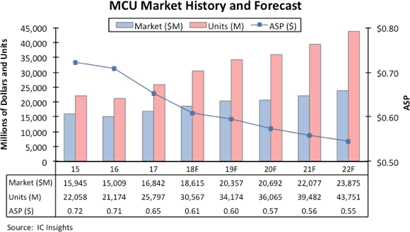 D’après une étude que vient de présenter la société d’analyse IC Insights, le marché mondial des microcontrôleurs est reparti à la hausse après une baisse de 6% en 2016, et devrait passer de 16,84 milliards de dollars en 2017 à 18,61Md$ en 2018 et 23,87Md$ en 2022. La forte hausse des ventes en volume (30,6 milliards de pièces prévues en 2018, et 43,8 milliards en 2022) compenserait la diminution constante du prix de vente moyen, qui se rapproche doucement mais surement des 50 cents.