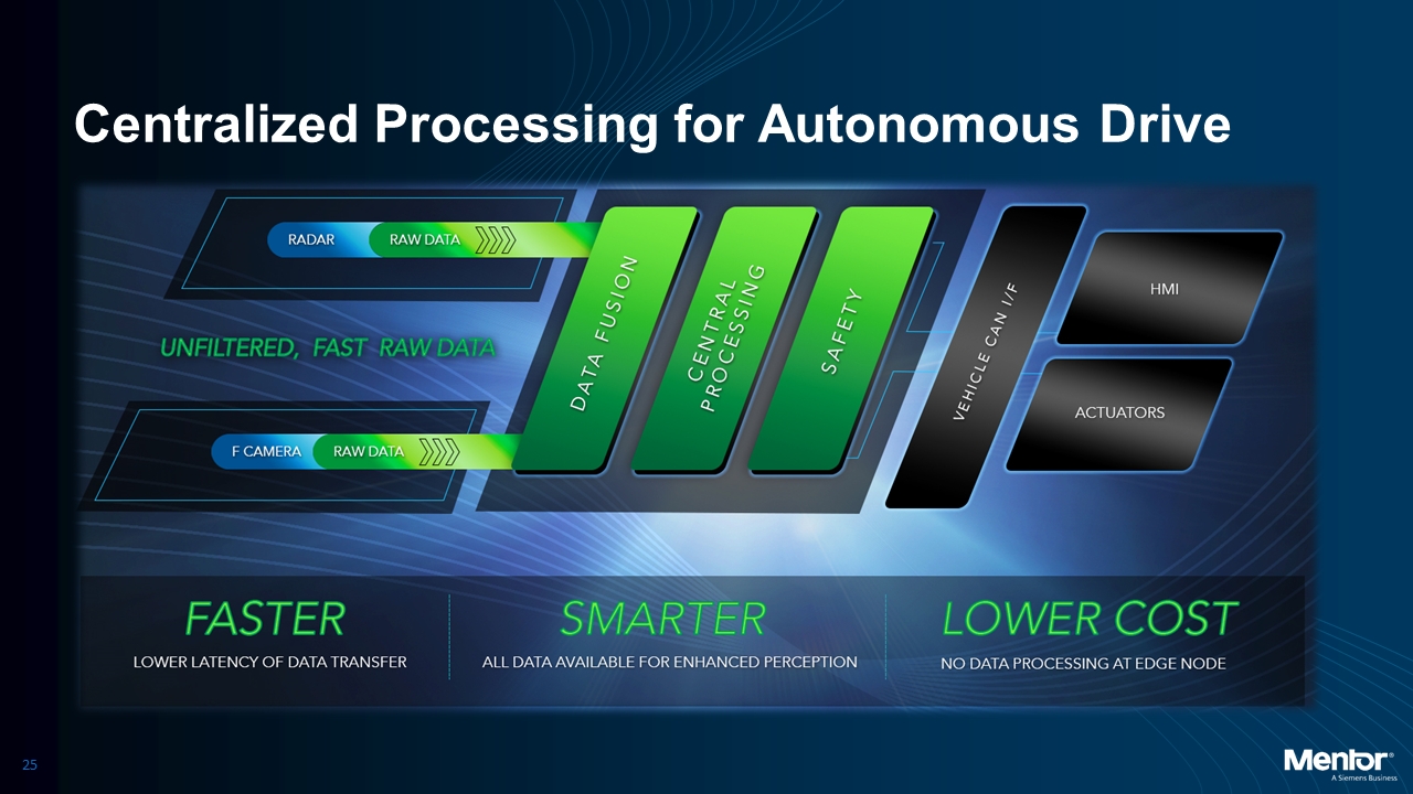 Actuellement, de nombreux véhicules avec fonctions d’aide à la conduite utilisent des calculateurs relativement simples fonctionnant à des fréquences d’horloge basses et avec une mémoire limitée pour exécuter un code relativement simple. La plupart des modules de capteurs contiennent des processeurs 8-16 bits qui effectuent des calculs sur les données brutes avant de transmettre ces données traitées à des systèmes de pointe (contrôle de collision, régulateur de vitesse, etc.). Ce type d’architecture distribuée dans laquelle le traitement des données se produit à chaque capteur est problématique, car elle introduit de la latence pendant le transfert d’informations essentielles à la sécurité, augmente le coût et la consommation d’énergie.