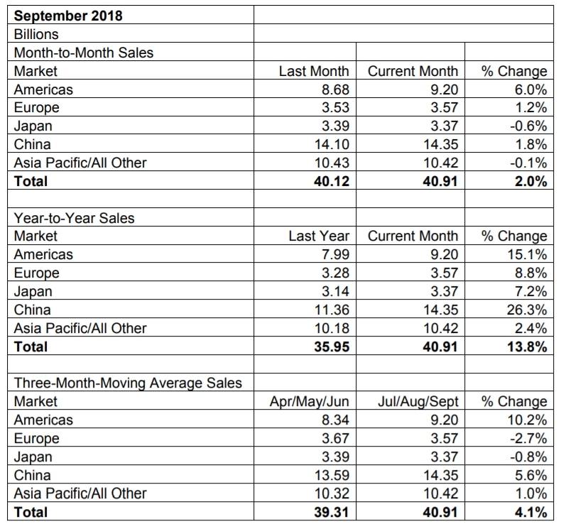 Par rapport à septembre 2017, les ventes de semi-conducteurs ont augmenté de 26,3% en Chine, de 15,1% dans les Amériques, de 8,8% en Europe, de 7,2% au Japon et de 2,4%% dans les autres pays d’Asie-Pacifique. Les ventes ont aussi augmenté par rapport au mois dernier dans les Amériques (6%), en Chine (1,8%) et en Europe (1,2%), mais ont légèrement diminué dans les autres pays d’Asie-Pacifique (-0,1%) ansi qu’au Japon (-0,6%).