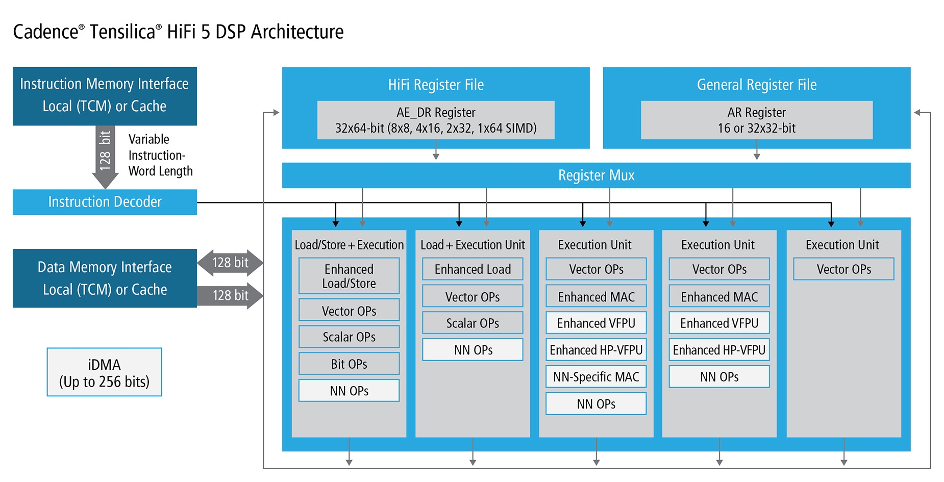 Le HiFi 5 prend en charge jusqu’à huit opérations MAC 32×32 bits ou seize MAC 16×16 bits par cycle. Pour accélérer les réseaux neuronaux, des opérations MAC 16×8 et 16×4 bits sont disponibles ainsi qu’une nouvelle bibliothèque de fonctions dédiées.