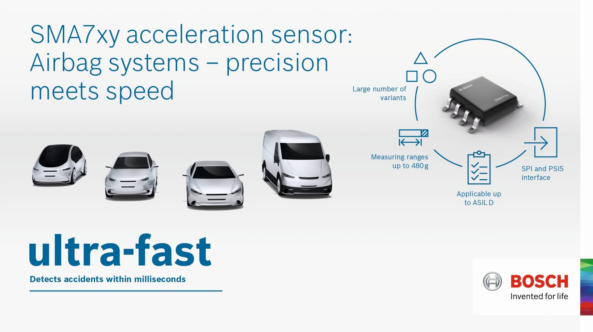 Bosch Sensortec présente les SMA7xy, une famille d’accéléromètres spécialement conçus pour accélérer le temps de réaction des airbags automobiles. Deux fois plus véloces que la génération précédente, ces capteurs d’accélération sont disponibles en quatre configurations d’axes de mesure, deux boîtiers (SOIC8 simple et LGA à composants passifs embarqués) et plusieurs pleines échelles de détection (jusqu’à 480g), et supportent plus de 80 protocoles de communication PSI5 différents.