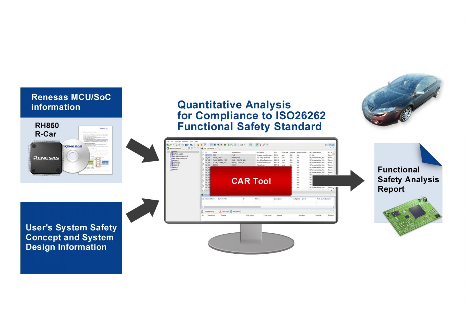 Renesas Electronics présente l’outil CAR (customizable analysis report) d’analyse de sûreté facilitant la mise en conformité de systèmes automobiles impliquant des microcontrôleurs et processeurs du japonais avec la norme ISO26262. Par l’intermédiaire d’une interface graphique, le logiciel unifie les aspects essentiels requis par la norme – SPFM (single point fault metric), LFM (latent fault metric), PMHF (probabilistic metric for random hardware failures), etc. – pour l’ensemble du composant ou chacun de ses éléments via différents niveaux hiérarchiques. De nombreux paramètres peuvent être personnalisés, comme la caractérisation, le mode, l’impact ou la couverture des défauts.