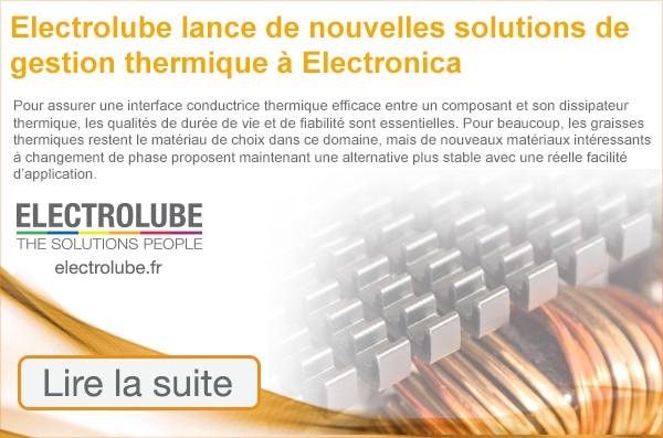 D’autres nouveaux produits de gestion thermique seront présentés cette année, dans la gamme très large de résines conductrices thermiques d’Electrolube, notamment l’époxy bicomposant ER2220 conducteur thermique et ignifuge, conçu spécifiquement pour répondre aux exigences croissantes d’une dissipation thermique efficace. Avec sa forte conductivité thermique de 1,54 W/m.K, ER2220 assure la facilité de traitement tout en offrant une protection et des performances supérieures sur une large gamme d’applications, notamment celles dans le domaine en croissance rapide de l’éclairage à LED.