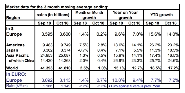 Depuis le début de l’année, les ventes européennes de semi-conducteurs, exprimées en dollars, ont augmenté de 14% par rapport à la même période en 2017. En octobre, les ventes mondiales ont atteint 41,810 milliards de dollars, en hausse de 1% par rapport au mois précédent et en hausse de 12,7% par rapport à octobre 2017. Tous les chiffres de croissance représentent moyenne mobile sur trois mois.