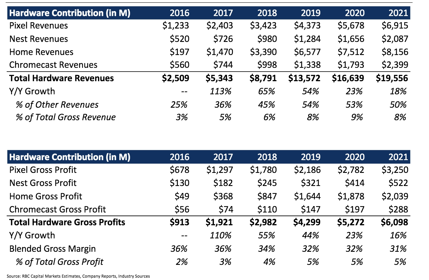 Ce dernier estime que les matériels électroniques de Google ont généré 8,8 milliards de dollars de revenus en 2018 (soit 6% du revenu total) et un bénéfice de 3 milliards de dollars (ou 4% du bénéfice d’exploitation avant impôts). D’ici 2021, ce chiffre pourrait passer à 19,6 milliards de dollars (soit 8% du revenu total) et à un bénéfice de 6,1 milliards de dollars (5% des bénéfices d’exploitation). RBC estime également qu’environ 43 millions d’appareils Google Home sont maintenant installés aux Etats-Unis et 9 millions hors des Etats-Unis.