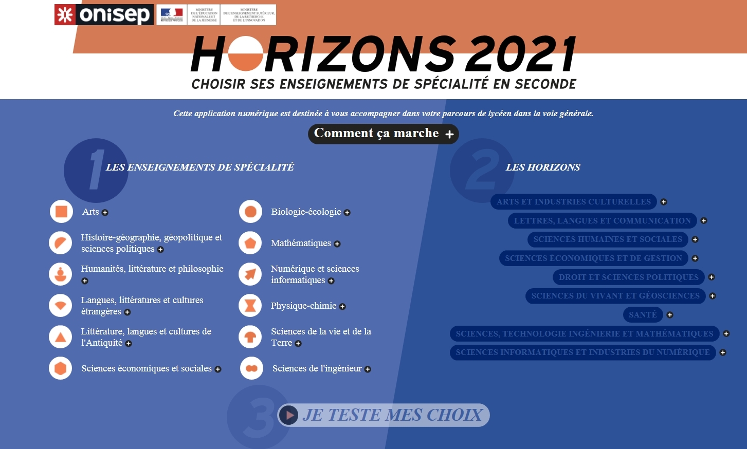 Pour les aider à préciser leur choix d’enseignements de spécialité en voie générale, « Horizons2021 », outil de simulation développé par l’Onisep, est désormais mis à la disposition des élèves de seconde et de leurs familles, ainsi qu’à celle du grand public : www.horizons2021.fr