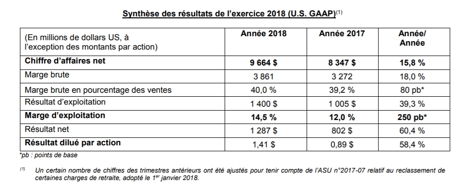 Au quatrième trimestre 2018, STMicroelectronics a réalisé un chiffre d’affaires de 2,65 milliards de dollars et un résultat net de 418 millions de dollars. Sur l’ensemble de l’exercice 2018, le chiffre d’affaires est en hausse de 15,8 % à 9,66 milliards de dollars pour un résultat net en hausse de 60,4% à 1,29 milliard de dollars.
