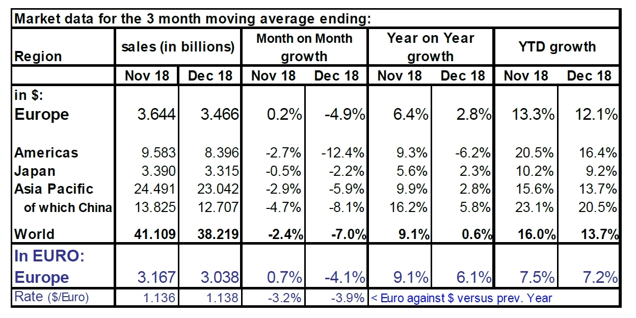 Sur une base mensuelle, les ventes européennes de semi-conducteurs en décembre 2018 se sont élevées à 3,466 milliards de dollars. Cela représente une augmentation de 2,8% par rapport au même mois en 2017 mais une légère baisse de 4,9% par rapport à novembre 2018, conformément aux tendances saisonnières.