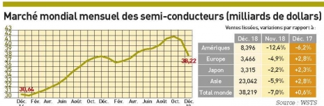 Malgré une forte baisse séquentielle en décembre (-7%) due essentiellement à une mauvaise performance des ventes américaines, l marché mondial des se mi-conducteurs a nettement progressé sur l’ensemble de l’année 2018 avec une hausse de 13,7% à 468,778 milliards de dollars. Avec une progression de seulement 0,6% en décembre 2018 par rapport au même mois