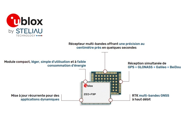 Conçu dans un format compact, le module ZED-F9P est équipé de la nouvelle génération de chipset Ublox F9 multi GNSS multi-bandes L1/L2.