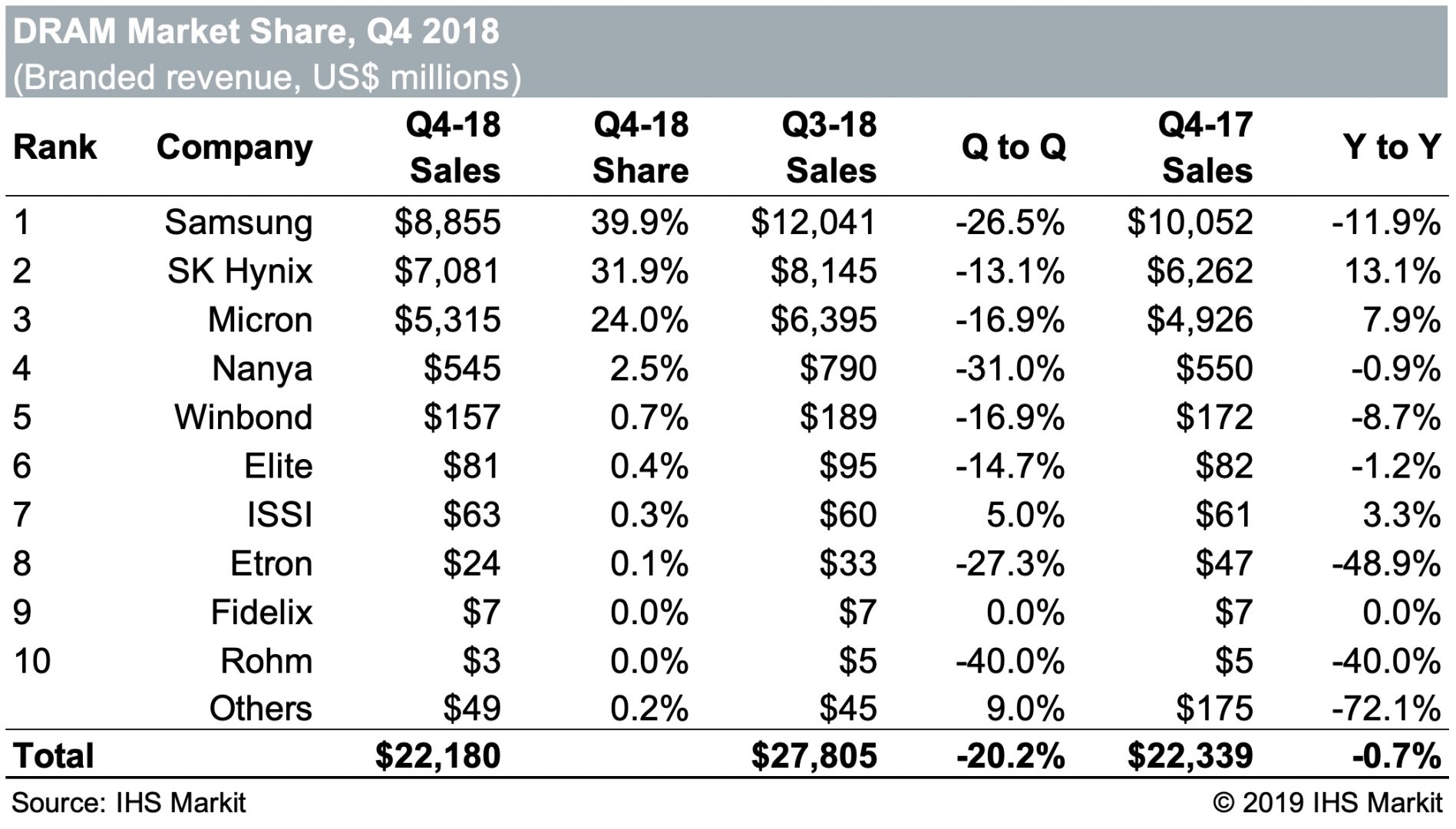 Malgré ses difficultés, Samsung continue de dominer le marché avec 39,9% des ventes mondiales de Dram au quatrième trimestre 2018, devant SK Hynix (31,9%) et Micron (24%).