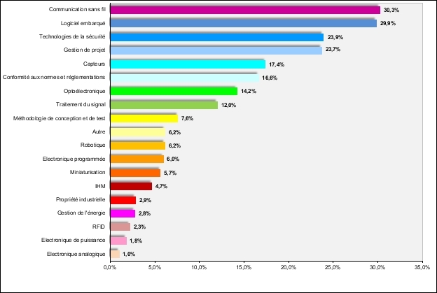 Viennent ensuite les séminaires traitant des capteurs (17,4 %), dont la valeur ajoutée, en interface avec le monde physique, est déterminante dans beaucoup de projets.Ils sont suivis par les thématiques de la conformité aux normes et aux réglementations (16,6%), de l’optoélectronique (14,2%), du traitement du signal (12%) et des méthodologies de conception et de test (7,6%).